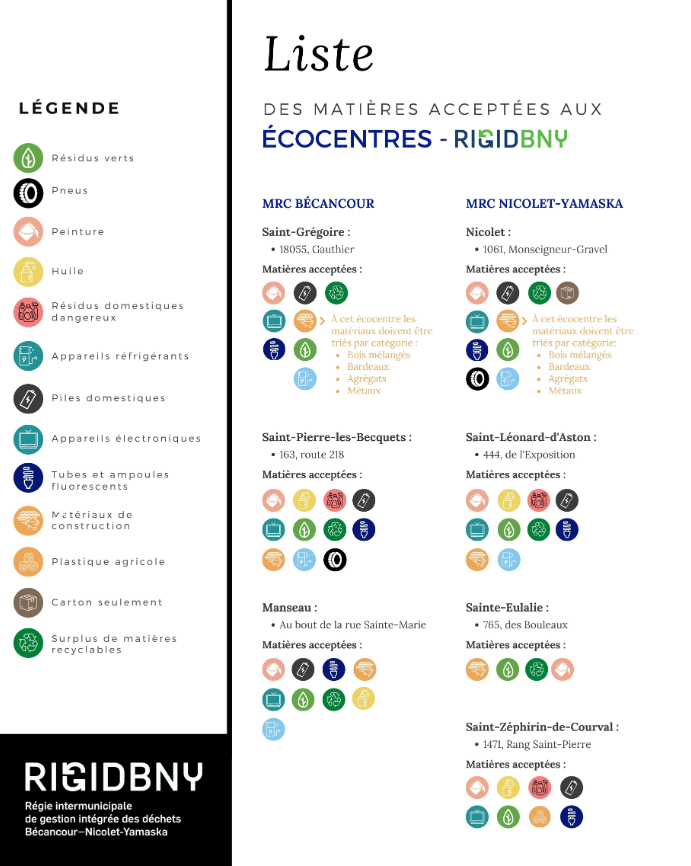 Liste des écocentres, des matières acceptées ainsi que des heures d'ouvertures.